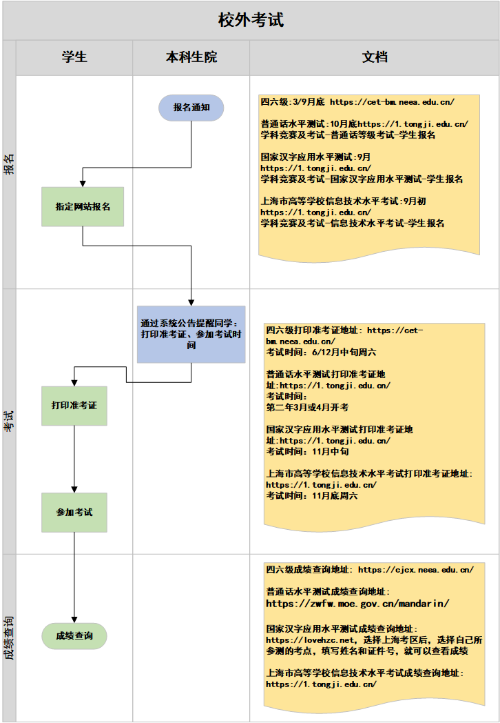 | 联系人:过老师 办公地点:瑞安楼806 电话:021-65980174 email:kaoshi@tongji.edu.cn 四六级网站: 四六级成绩查询网站: 普通话水平考试成绩查询网站: http://zwfw.moe.gov.cn/mandarin 国家汉字应用水平测试成绩查询网站: https://lovehzc.net,选择上海考区后,选择自己所参测的考点,填写姓名和证件号,就可以查看成绩。 |